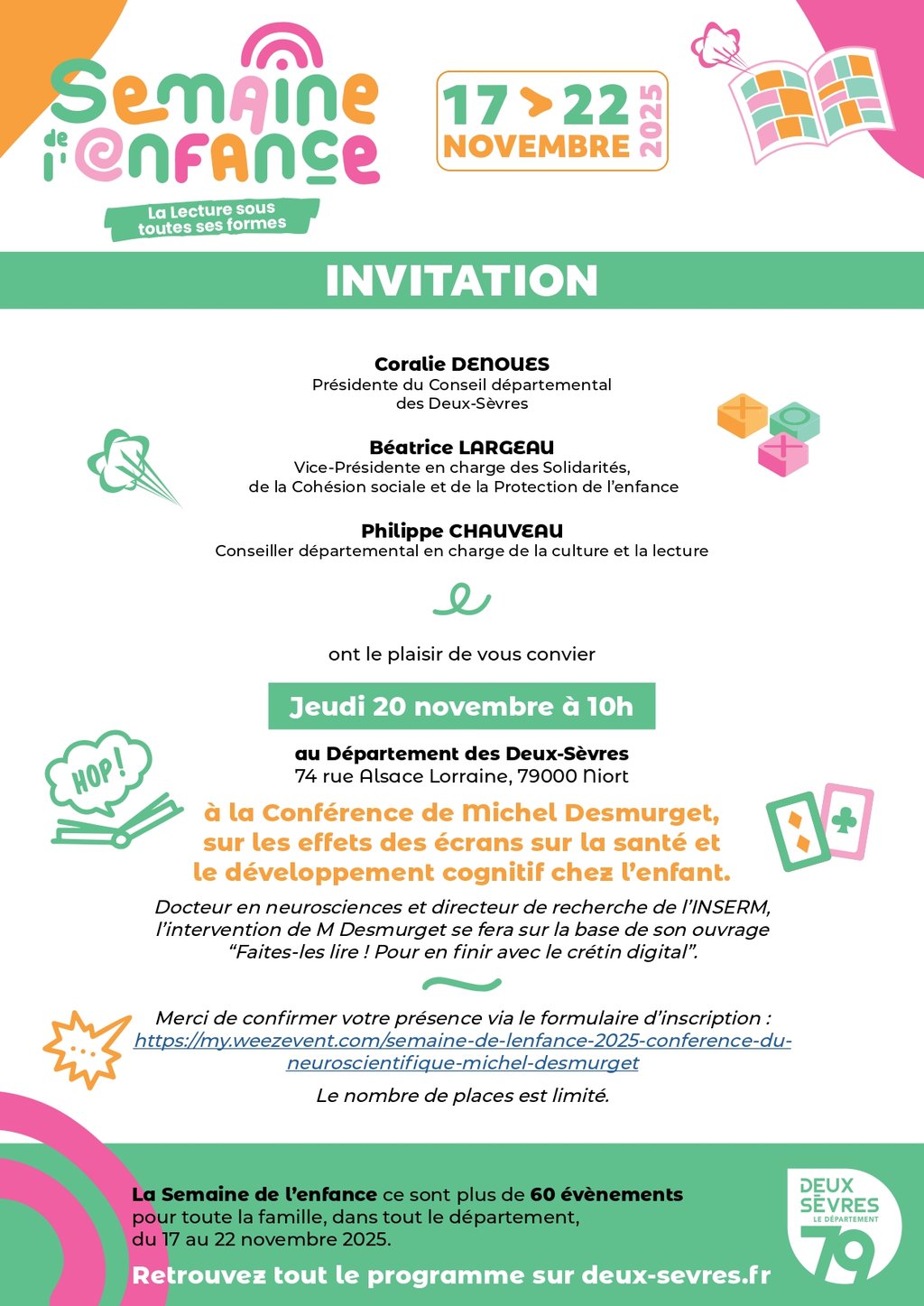 Sur inscription https://my.weezevent.com/semaine-de-lenfance-2025-conference-du-neuroscientifique-michel-desmurget