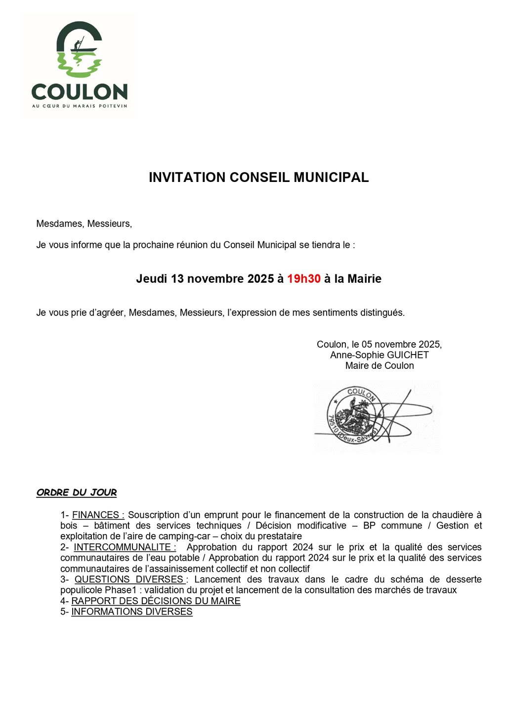 Nous vous informons que le prochain conseil municipal aura lieu le jeudi 13 novembre à 19h30 à la mairie.