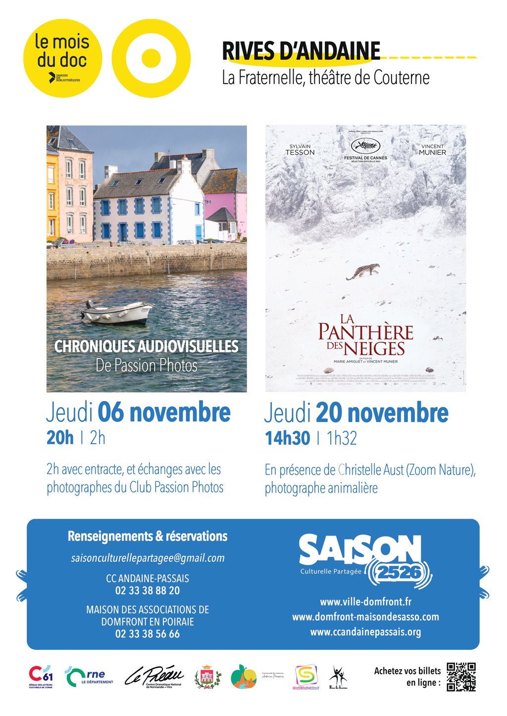 Jeudi 20 Novembre, à 14h30 au théâtre de Couterne vous pourrez découvrir dans le cadre du Mois du Film Documentaire et de la saison culturelle partagée, la panthère des neiges.