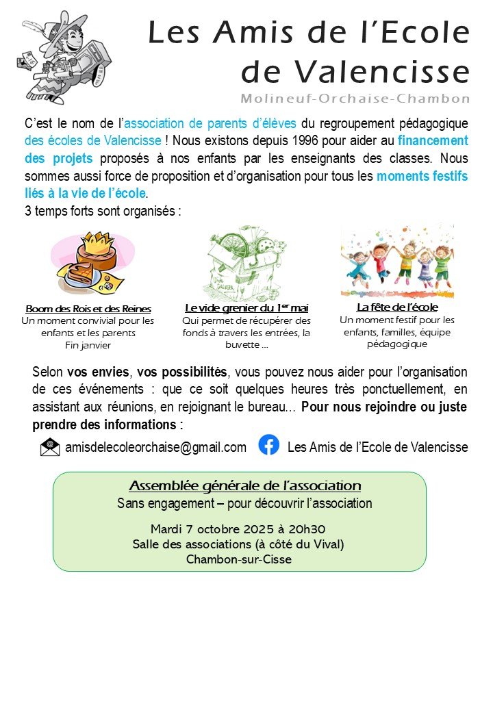 Rendez-vous le mardi 7 octobre à 20h30 pour notre première Assemblée Générale de l'année scolaire 2025-2026. A l'ordre du jour : bilan de l'année passée, élection du bureau, présentation des projets des écoles à financer ! La réunion se fait dans la salle des associations de Chambon-sur-Cisse (juste à côté du Vival)