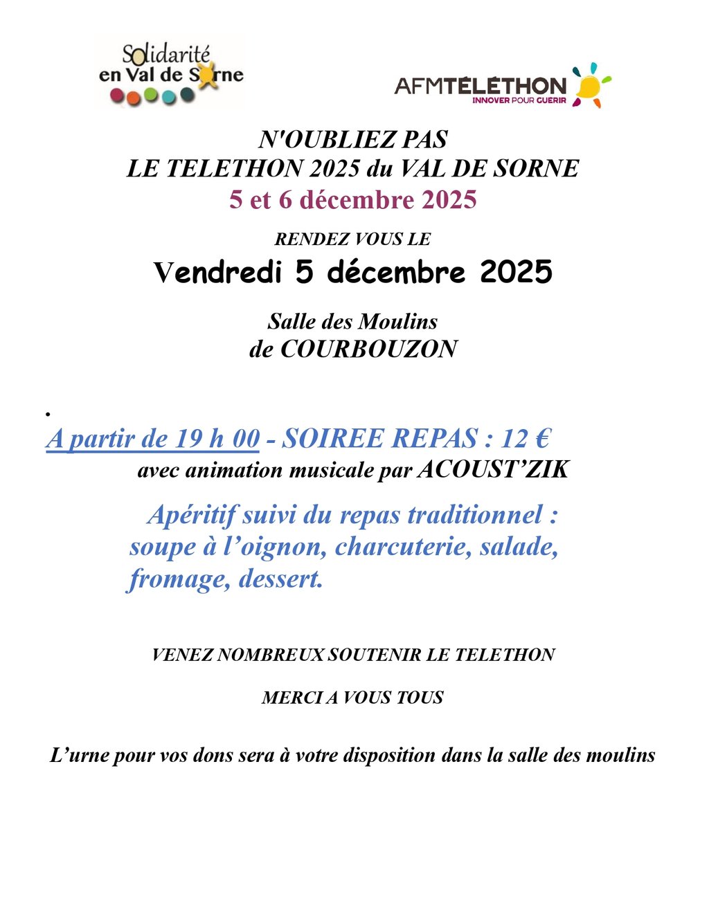 Comme chaque année, avec Solidarité en Val de Sorne, nous vous proposons une soirée soupe à l'oignon, avec animation musicale, au profit du Téléthon.