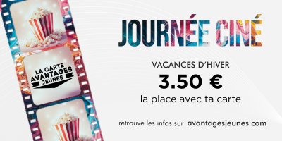 La carte Avantages Jeunes organise les journées ciné pendant les vacances d'hiver ! Le tarif de la place de cinéma est à 3,50 € sur toutes les séances valables à des dates définies.