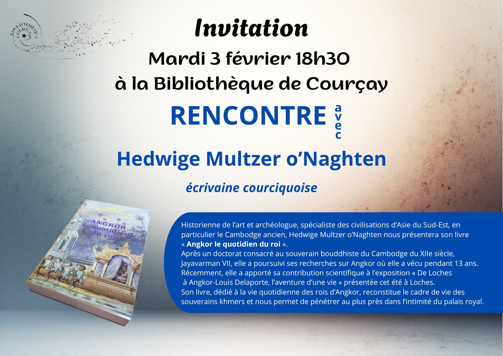 Le mardi 3 février 2026, à 18h30, la bibliothèque municipale de Courçay reçoit Hedwige Multzer o'Naghten, écrivaine courciquoise, historienne de l'art et archéologue, spécialiste des civilisations d'Asie du Sud-Est.