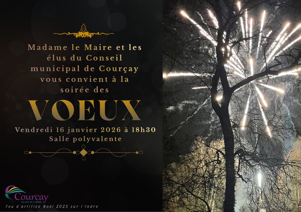 Mme le maire et les élus du Conseil municipal vous convient à la cérémonie des voeux de Courçay, le vendredi 16 janvier, à partir de 18h30, salle polyvalente.
