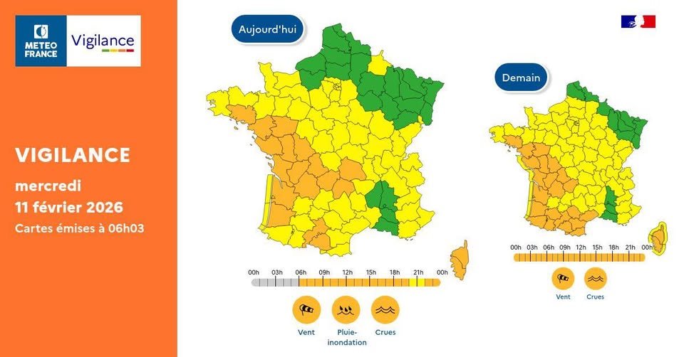 La commune de Courçon vous informe que le département est placé en vigilance Orange pour le risque de vents violents à partir du mercredi 11/02/2026.