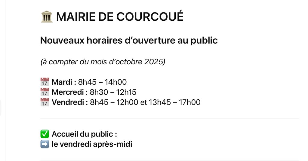 MAIRIE DE COURCOUÉ - NOUVEAUX HORAIRES D’OUVERTURE