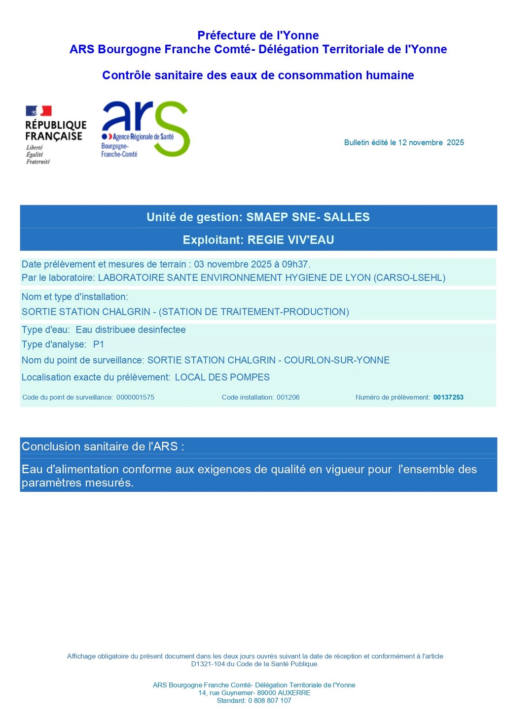 Rapport du contrôle sanitaires des eaux de consommation humaine