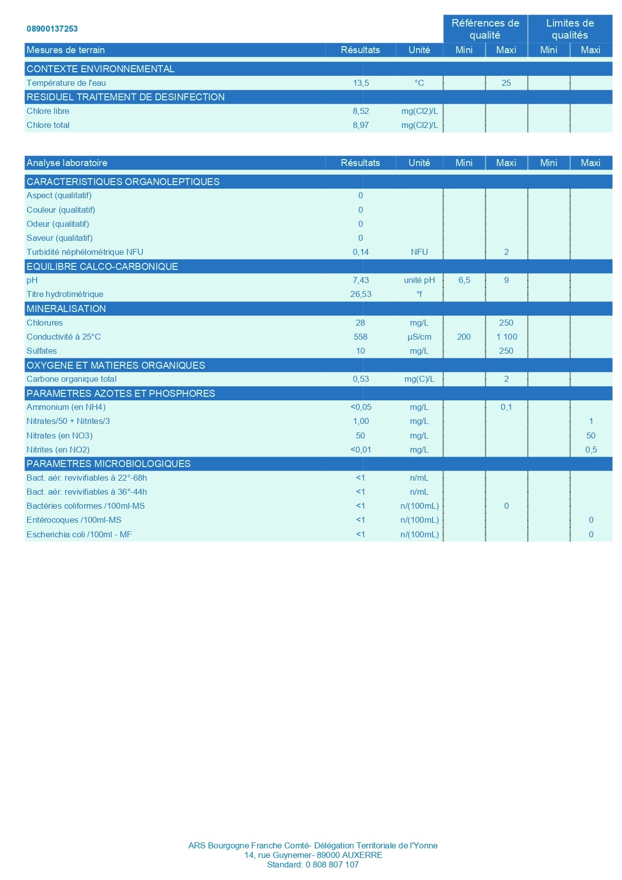 EAU D'ALIMENTATION CONFORME AUX EXIGENCES DE QUALITÉ EN VIGUEUR POUR L'ENSEMBLE DES PARAMETRES MESURÉS