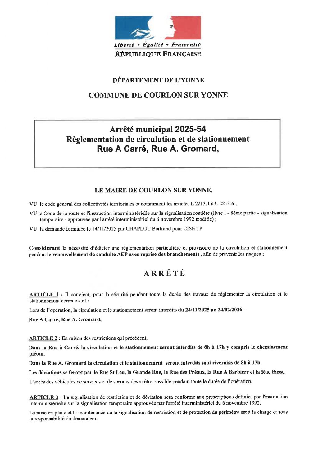 ARRÊTÉS DE CIRCULATION ET STATIONNEMENT CONCERNANT LES TRAVAUX DU 24/11/2025