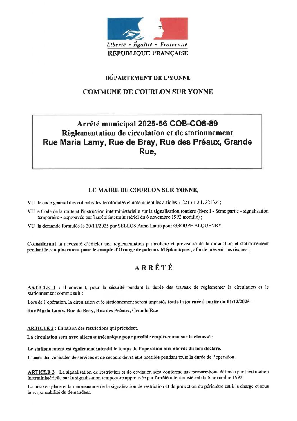 Veuillez trouver l'arrêté de circulation et de stationnement concernant le remplacement des poteaux téléphoniques à partir du 01/12/2025 :