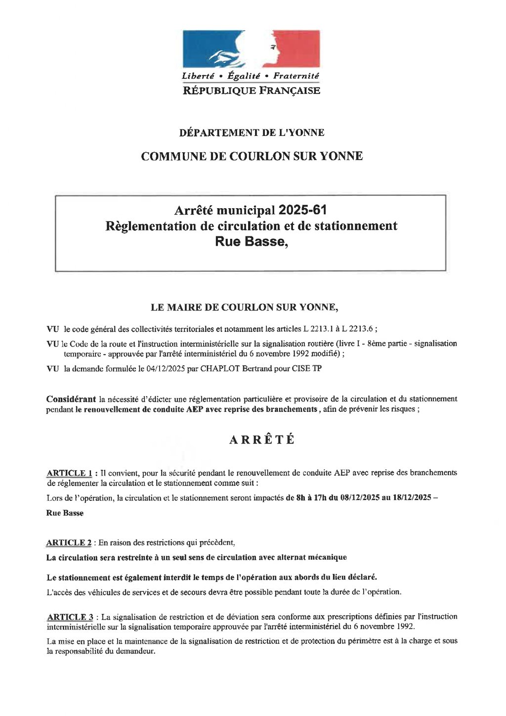ARRÊTÉ DE CIRCULATION ET STATIONNEMENT RUE BASSE À PARTIR DU 08/12/2025