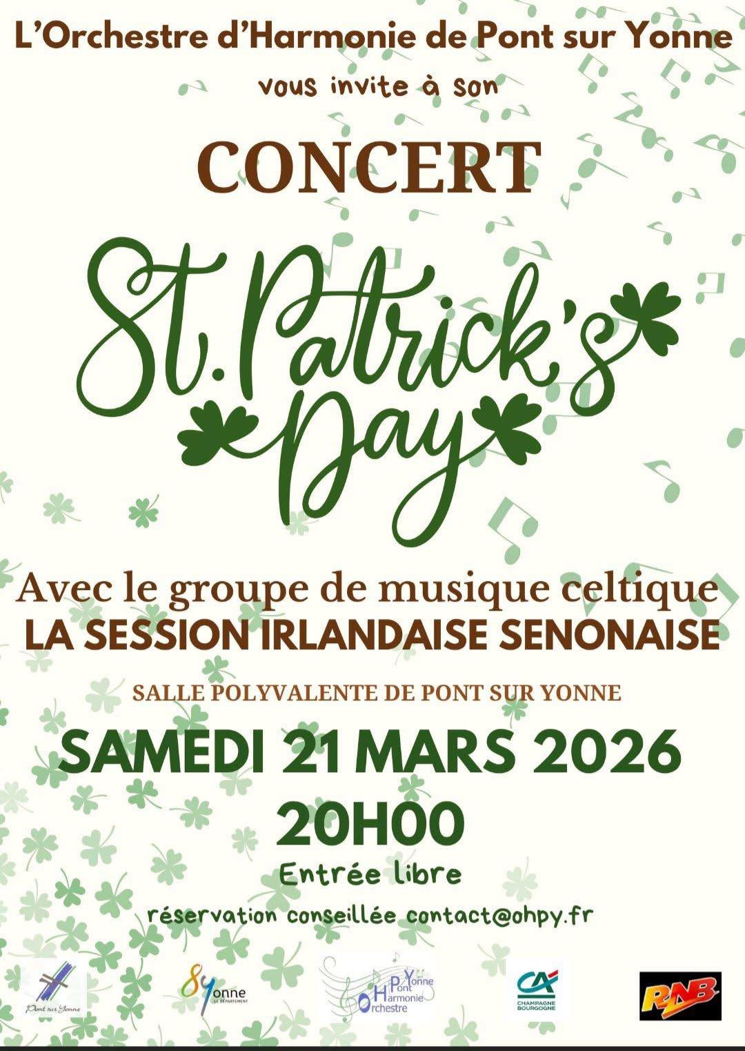 L'orchestre d'harmonie de Pont-sur-Yonne organise un concert pour la Saint-PATRICK le 21 mars 2026 à 20h00.