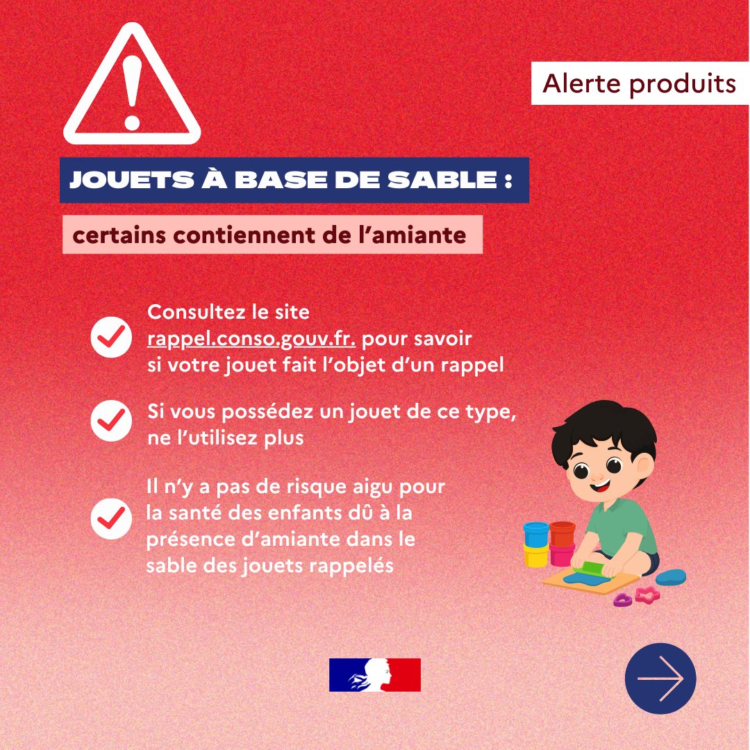 La direction générale de la Concurrence, de la Consommation et de la Répression des Fraudes attire votre attention au regard des risques pour la santé liés à la possible présence d'amiante dans certains jouets pour enfants à base de sable (sable magiques, sables à dessiner ou à modeler, figurines extensibles....).