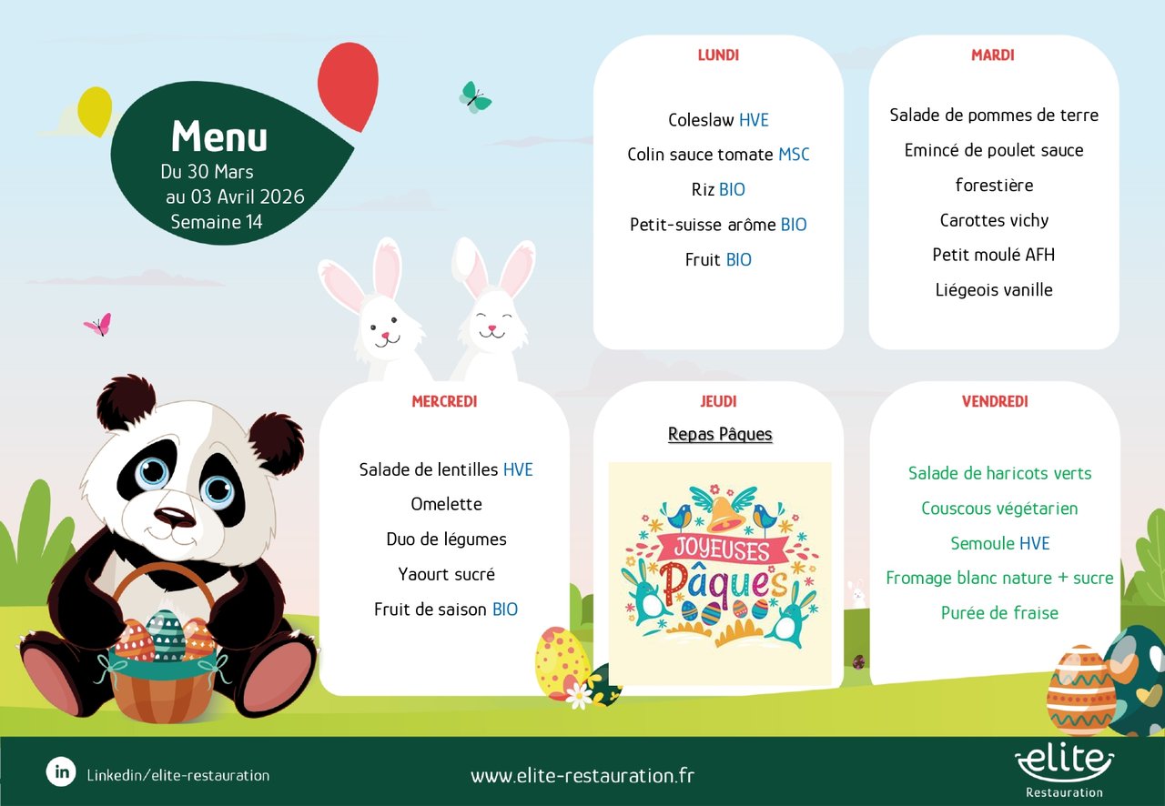 Menu de la cantine pour la semaine du 30 mars au 3 avril 2026