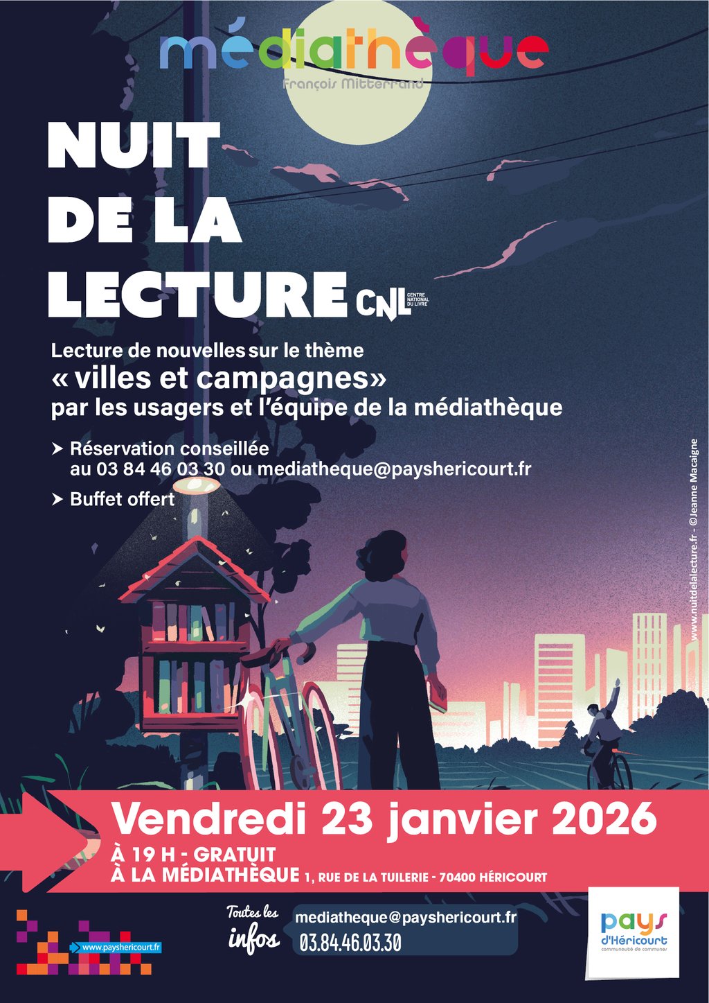 Dans le cadre des Nuits de la lecture, la médiathèque d'Héricourt organise sa troisième Nuit de la lecture le vendredi 23 janvier à 19 h, dans son bâtiment rénové.