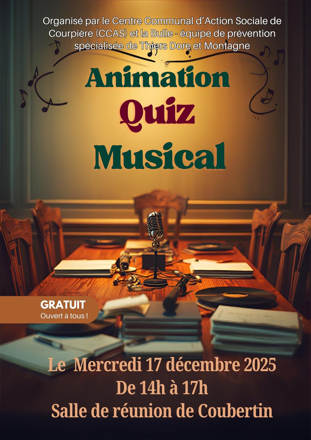 Ă lâapproche des fĂȘtes, quoi de mieux quâun moment convivial pour partager des souvenirs, rire et tester ses connaissances musicales ? Le mercredi 17 dĂ©cembre 2025, nous vous donnons rendez-vous pour un aprĂšs-midi spĂ©cial âQuiz Musicalâ.