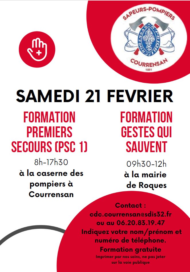 La caserne des pompiers de Courrensan vous convie à une journée de formation aux premiers secours le samedi 21 février 2026 de 8h à 17h30 ou à la formation des gestes qui sauvent, le même jour, de 9h30 à 12h à la mairie de Roques.