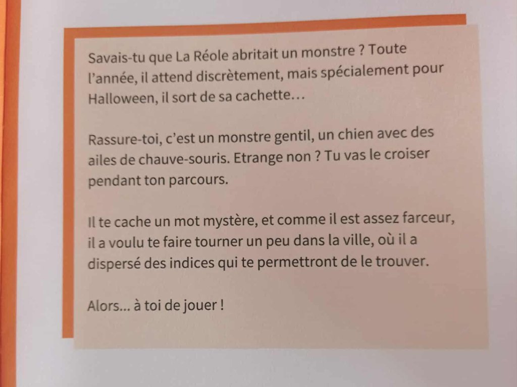 Pendant les vacances de la Toussaint, pars à la recherche du Petit Monstre du Manoir de La Réole et résous les mystères qui hantent la ville… Rendez-vous à l’Office de Tourisme pour récupérer ton livret et pars sur les traces du petit monstre ! Pour résoudre cette quête, tu devras compléter des rébus, répondre à questions historiques et être observateur. Suis bien la carte pour trouver chaque lieu où se trouvent les énigmes. Une aventure gratuite pensée pour les 6–12 ans. Qui osera percer tous ses secrets ?