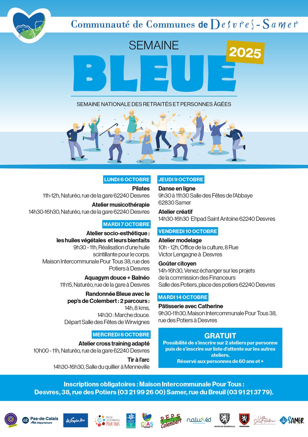 Possibilité de s’inscrire sur 2 ateliers par personne puis de s’inscrire sur liste d’attente sur les autres ateliers. Réservé aux personnes de 60 ans et +. Inscriptions obligatoires : Maison Intercommunale Pour Tous : Desvres, 38, rue des Potiers (03 21 99 26 00) Samer, rue du Breuil (03 91 21 37 79).