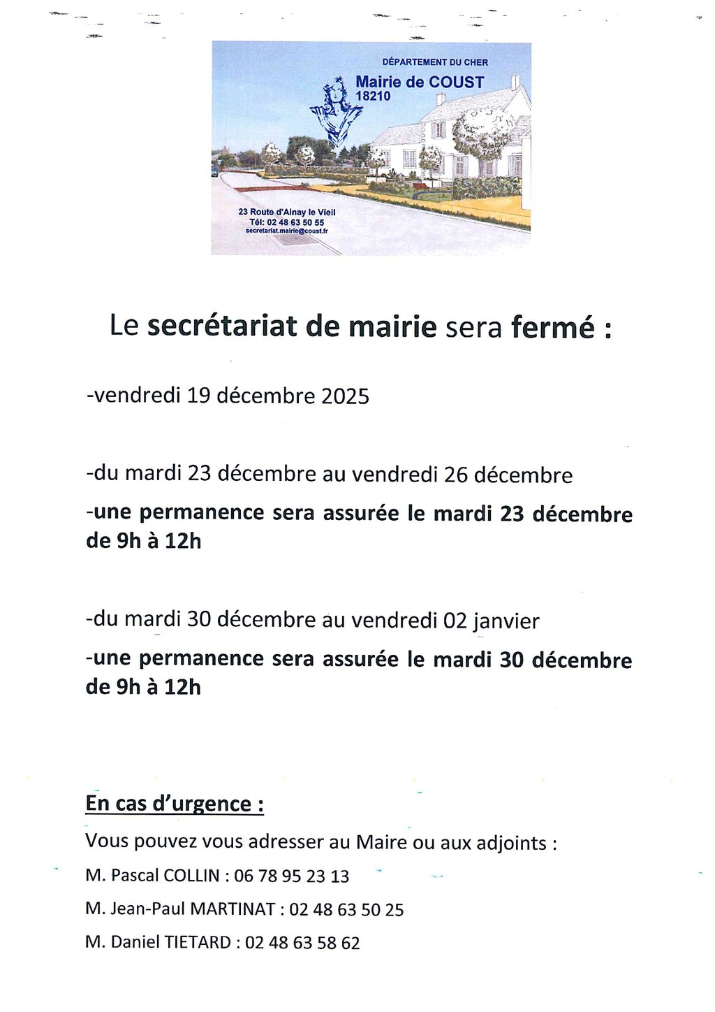 FERMETURE SECRETARIAT DE MAIRIE