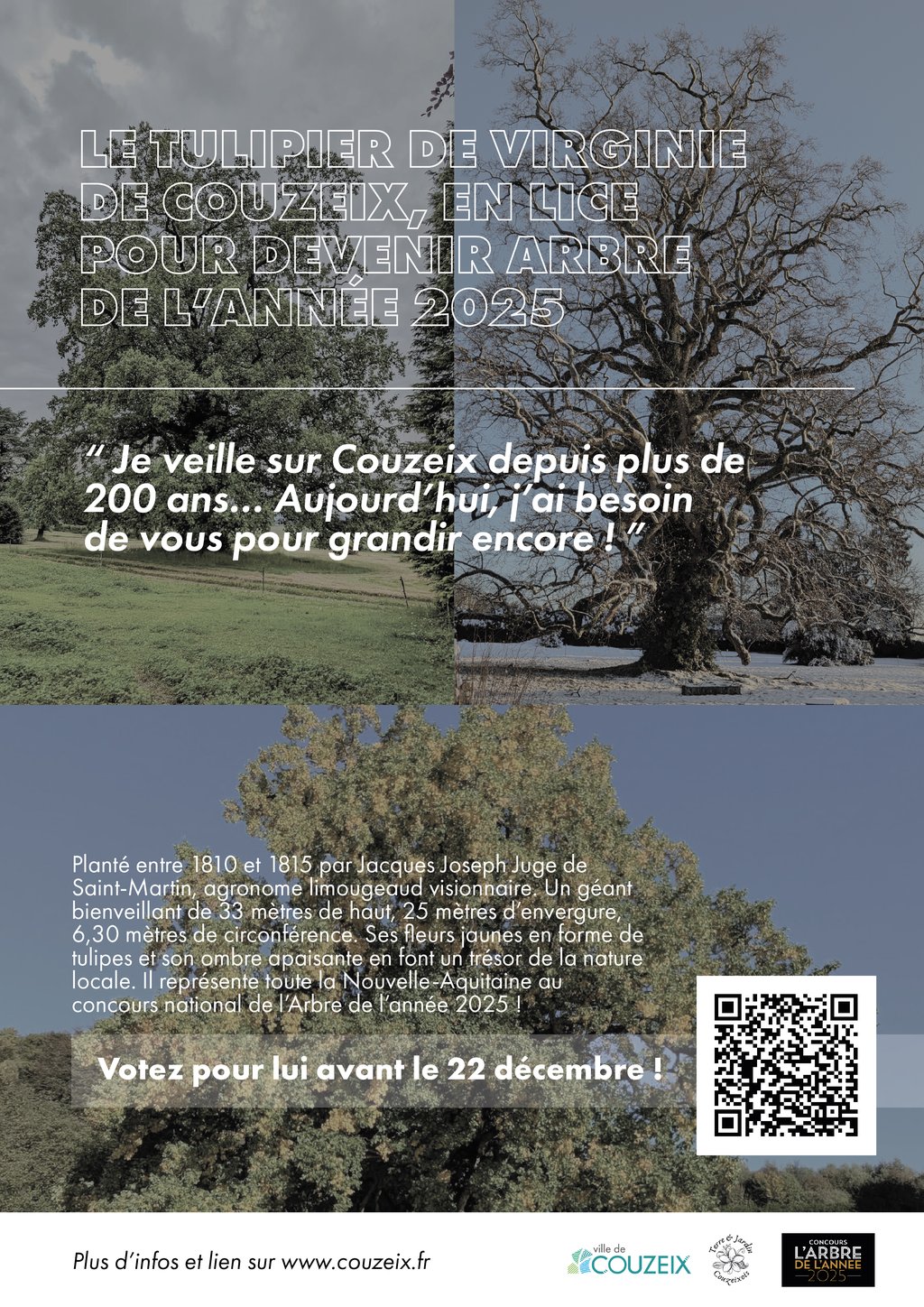 Il se dresse fièrement depuis plus de deux siècles, veillant sur la terre couzeixoise avec élégance et sagesse. Le Tulipier de Virginie de Couzeix, arbre majestueux de 33 mètres de haut, a été choisi pour représenter toute la région Nouvelle-Aquitaine au concours national de l’Arbre de l’année 2025. Une distinction rare et précieuse, qui fait rayonner notre commune à l’échelle de la France entière !