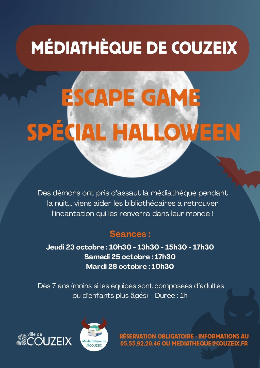 Rendez-vous à la médiathèque pendant les vacances de la Toussaint, durant lesquelles plusieurs séances d'escape game (jeu d'énigmes et de défis à réaliser en petit groupe) vous sont proposées. Les dates et horaires sont les suivants :