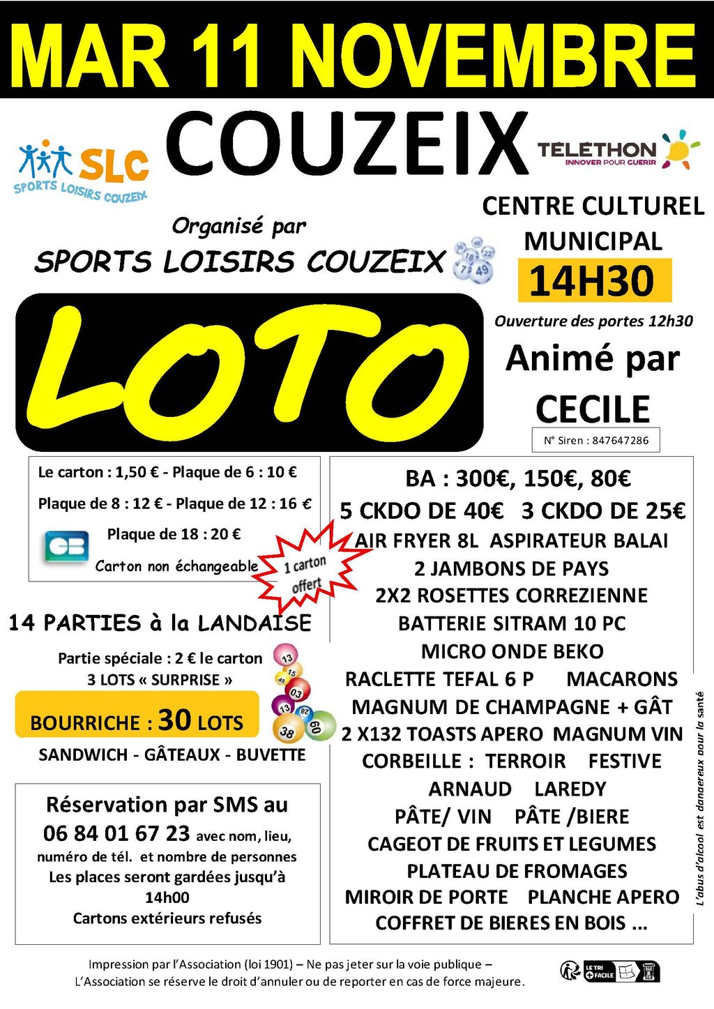 Début du loto : 14h30 (ouverture des portes à 12h30)