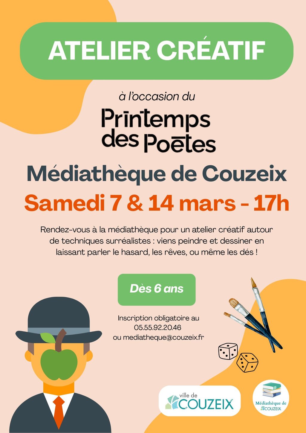 À l’occasion du Printemps des Poètes, la médiathèque de Couzeix propose deux ateliers créatifs originaux pour petits et grands les samedi 7 et 14 mars à 17h.