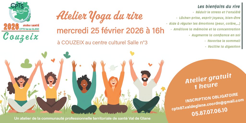 La Communauté Professionnelle Territoriale de Santé (CPTS) Val de Glane organise un atelier de Yoga du Rire ouvert à tous, le mercredi 25 février à 16h, à l’annexe 3 du Centre Culturel.
