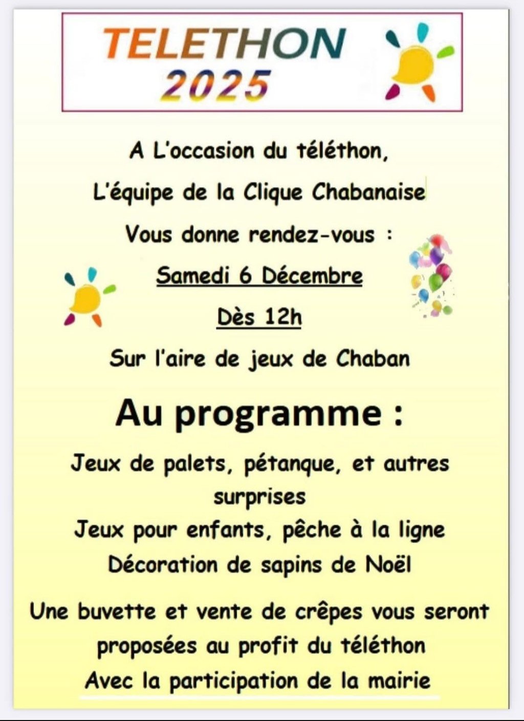 đą La Clique Chabanaise vous donne rendez-vous le 6 dĂ©cembre Ă l'occasion du tĂ©lĂ©thon.