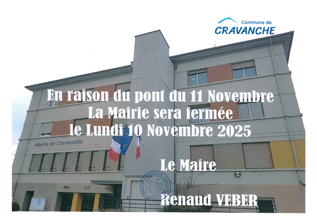 Pour information : Fermeture de la Mairie le lundi 10 novembre 2025.