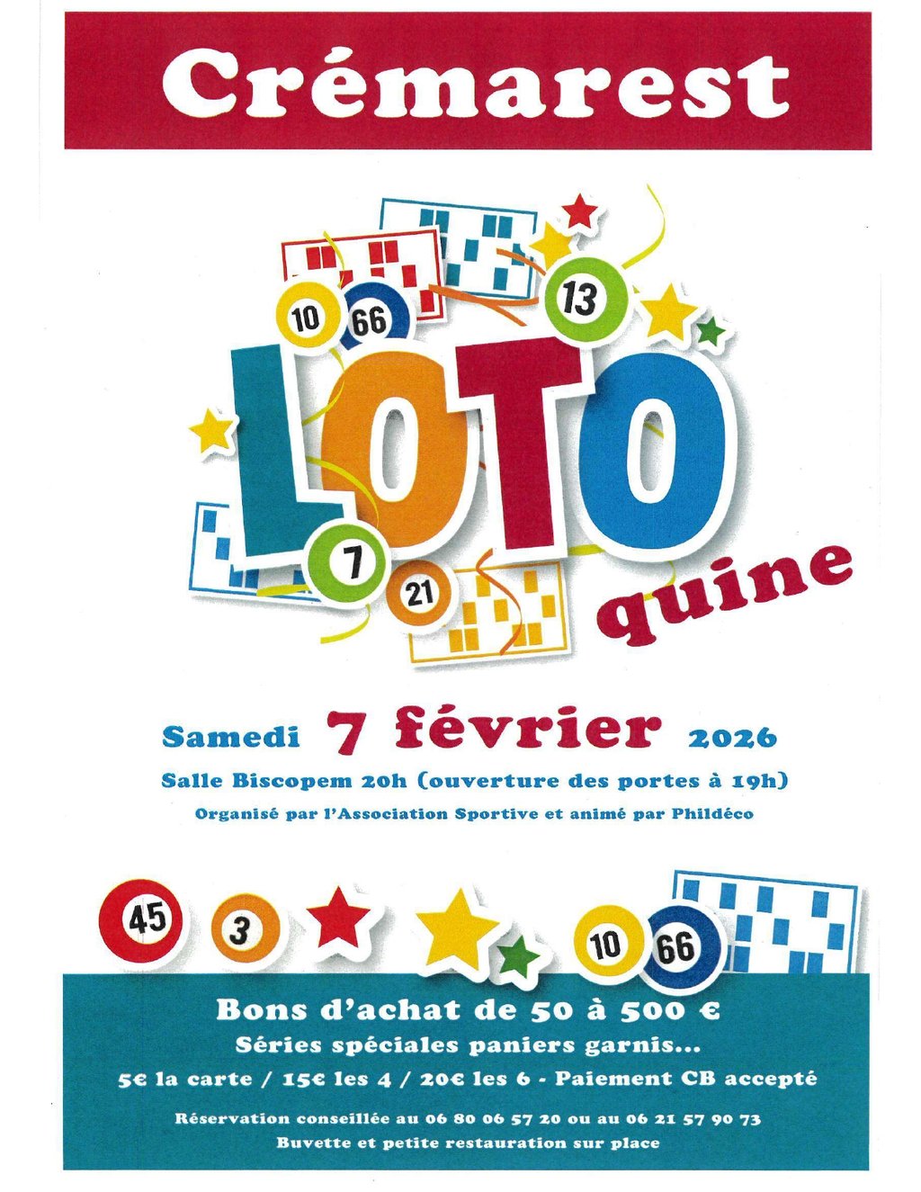 L'Association Sportive organise un loto quine le Samedi 07 Février à 20h00 à la salle Biscopem animé par Phildéco.