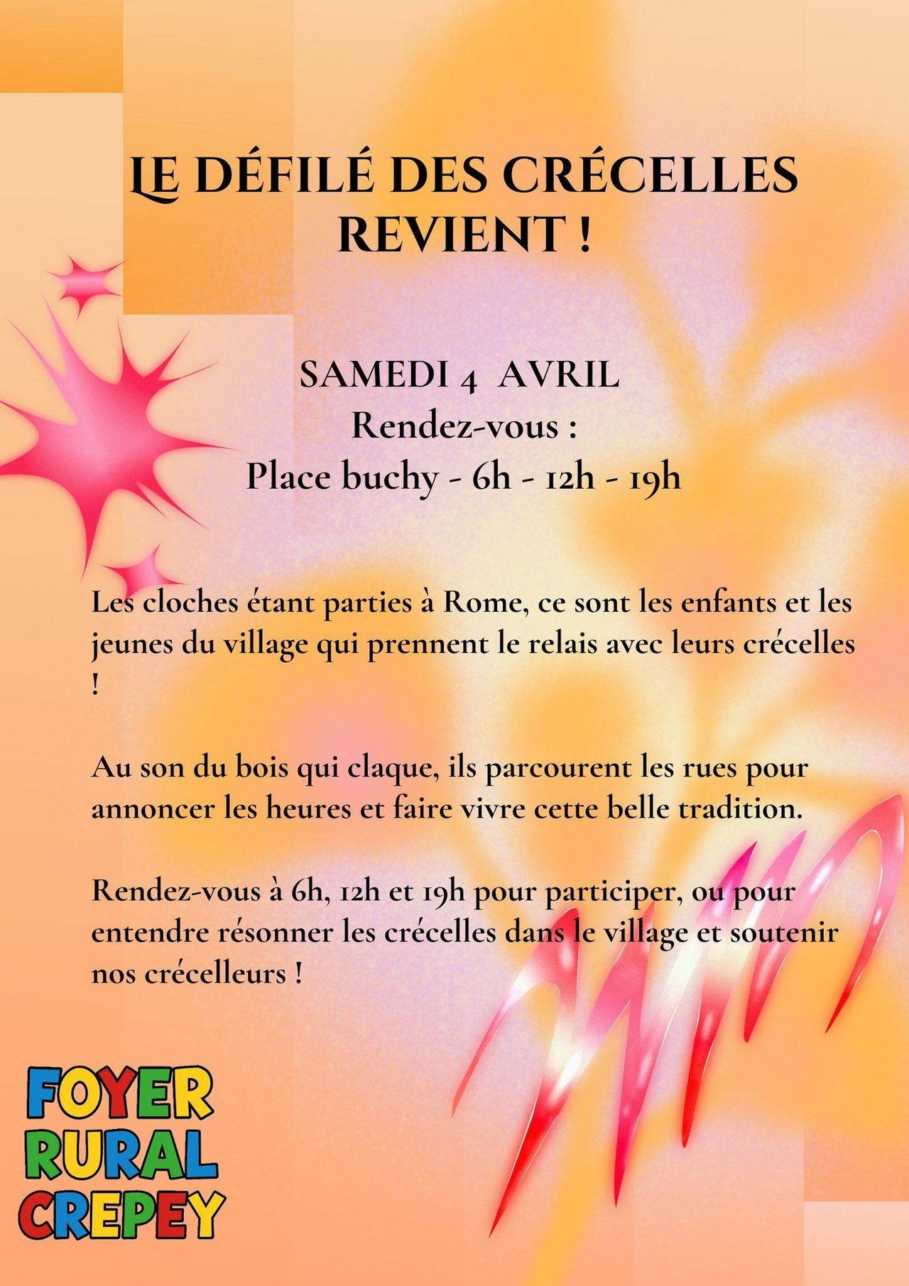 Le samedi 4 avril, nous perpétuons la tradition avec le Défilé des Crécelles dans les rues du village !