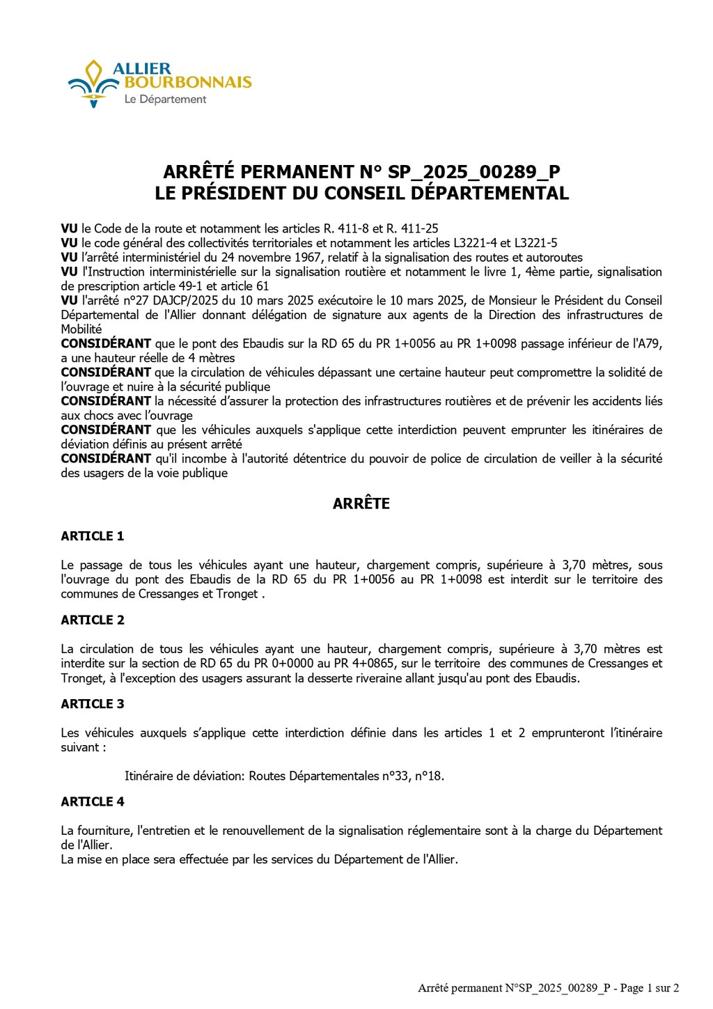Le passage de tous les véhicules ayant une hauteur, chargement compris, supérieure à 3,70 mètres, sous l'ouvrage du pont des Ebaudis de la RD 65 du PR 1+0056 au PR 1+0098 est interdit sur le territoire des communes de Cressanges et Tronget.
