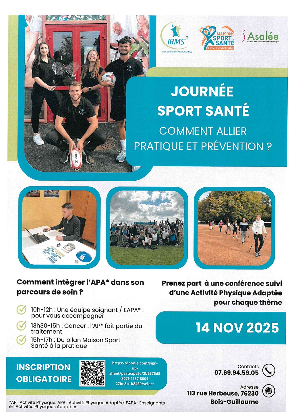 La Maison Sport Santé de l'Institut Régional de Médecine du Sport et de la Santé (IRMS²) a le plaisir de vous convier à sa Journée Sport Santé , qui se tiendra le vendredi 14 novembre 2025 .