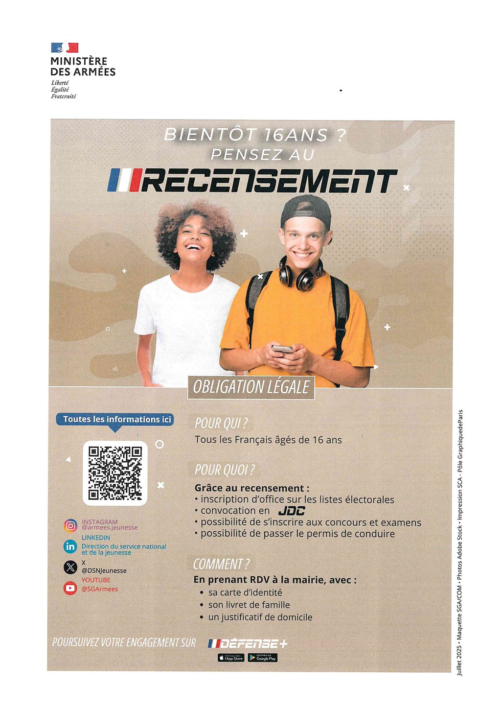 Chaque jeune Français âgé de 16 ans doit se faire recenser à la mairie dans les 3 mois qui suivent son anniversaire.