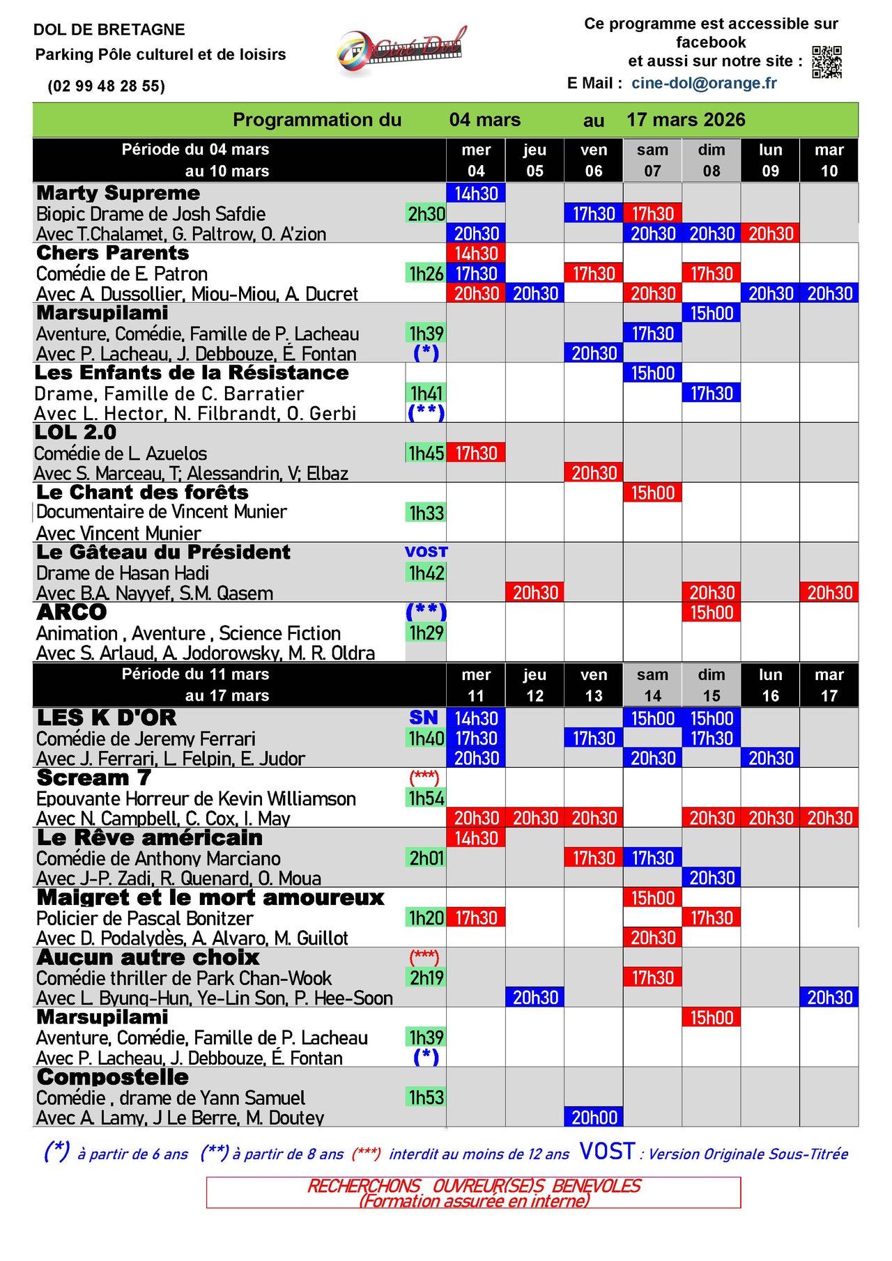 Programmation CINEDOL du 04/03/2026 au 17/03/2026