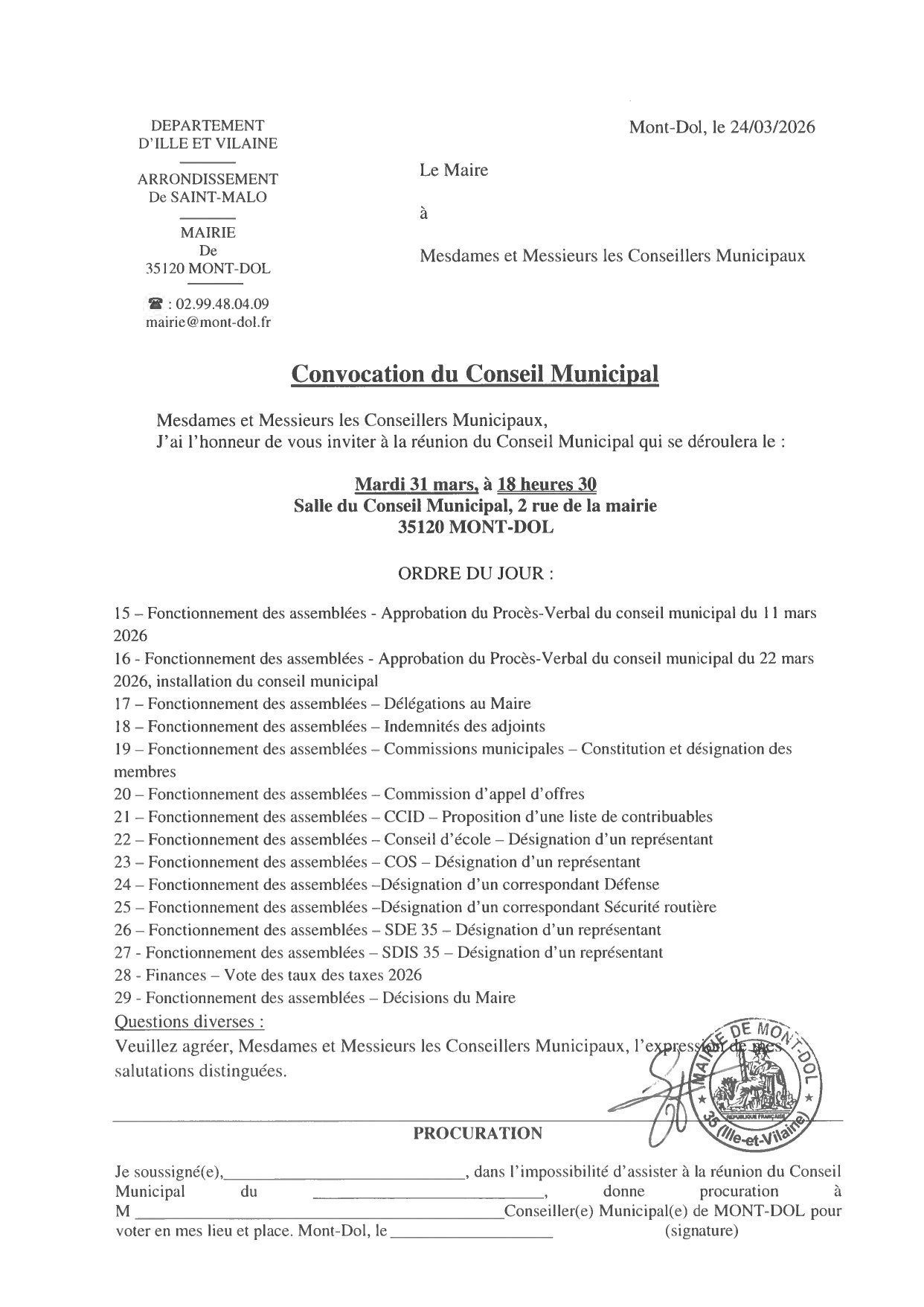 Le Conseil municipal se tiendra dimanche 22 mars Ă 11h.