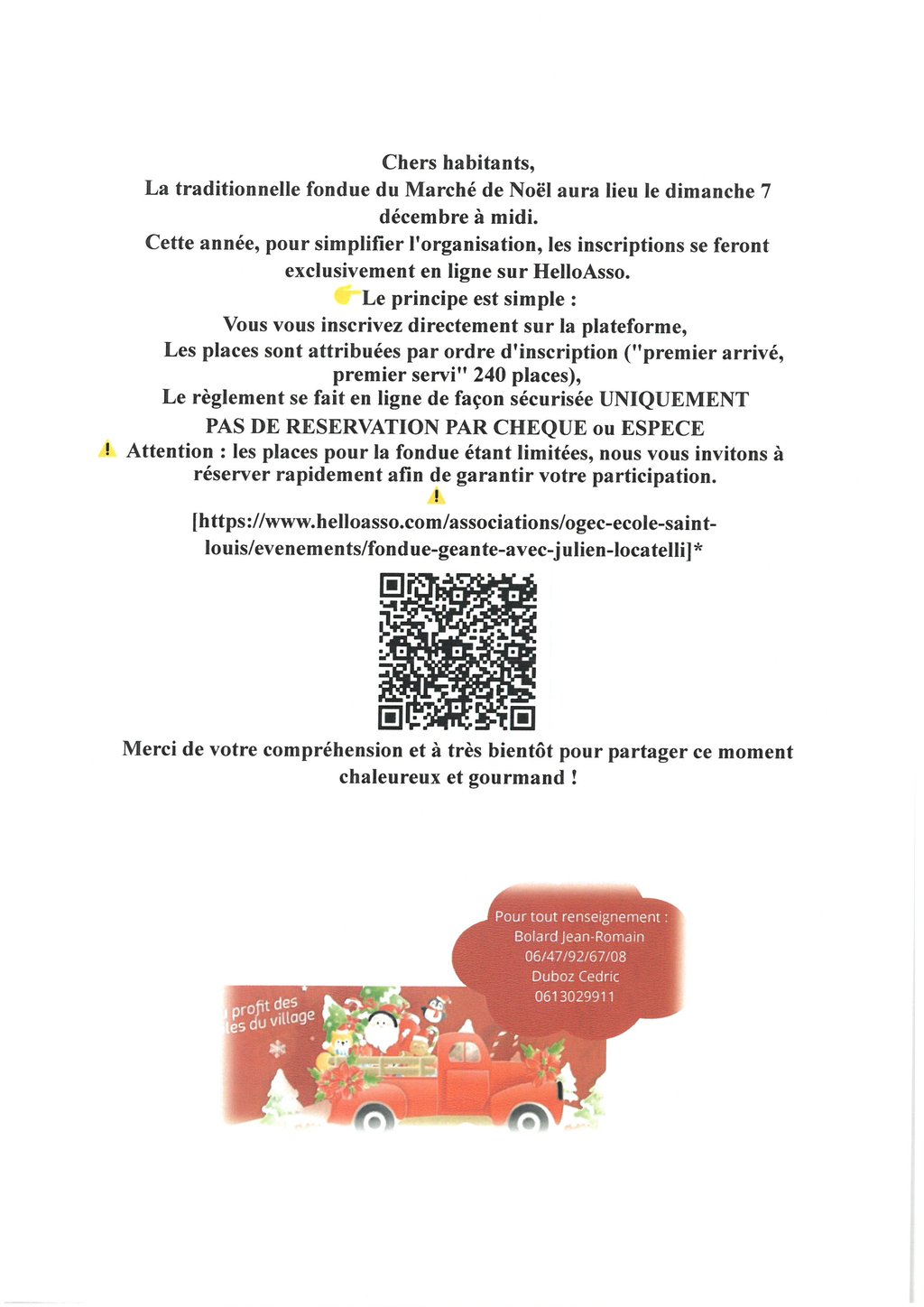 - et le dimanche de avec la fondue géante du midi à réserver sur le lien ci-dessous et la présence de Julien Locatelli et la descente du père noël en rappel depuis le clocher de l'église a 17h.