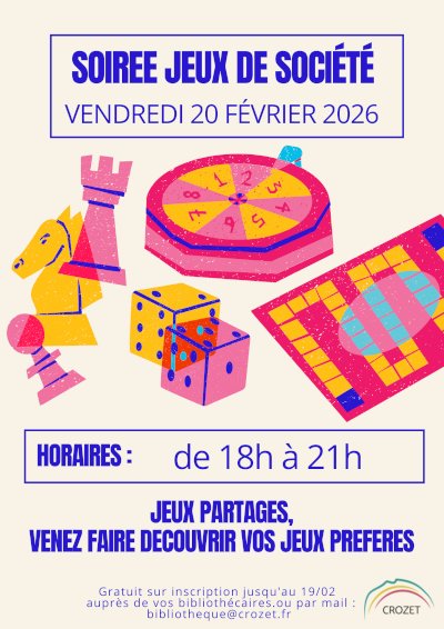 Gratuit sur inscription par mail : bibliotheque@crozet.fr ou auprès de vos bibliothécaires avant le 19 février 2026.