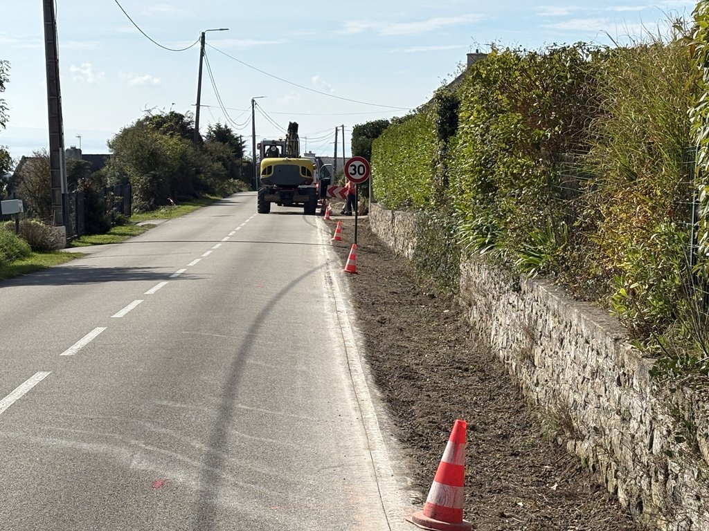Dans la continuité des travaux réalisés les années précédentes, de nouveaux trottoirs sont en cours d’aménagement le long de la route de l’Aber. Ce chantier, confié à l’entreprise Eurovia, vise à sécuriser les déplacements des piétons sur cet axe très fréquenté, en particulier durant la saison estivale.