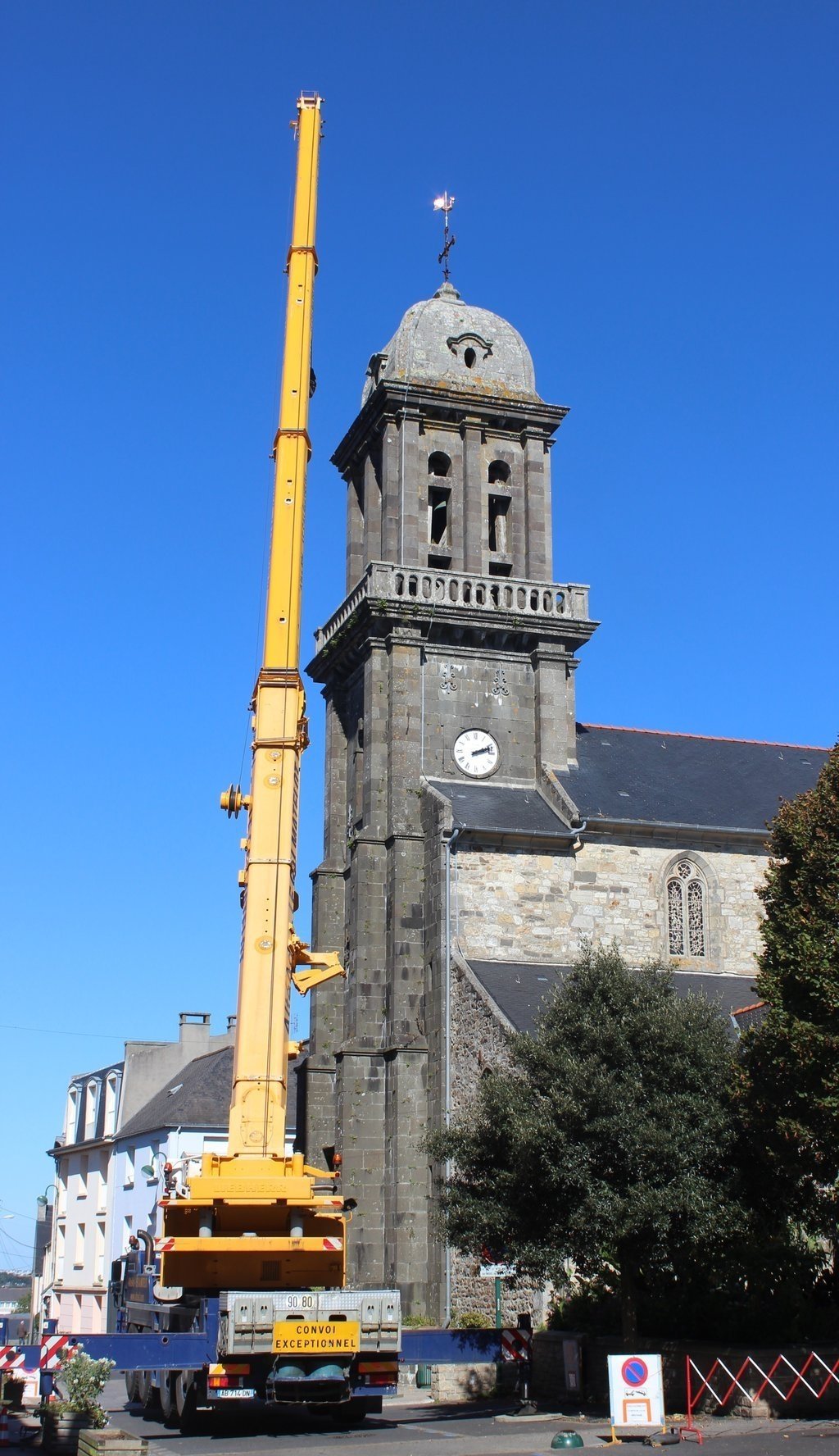 En raison de travaux de rénovation des cloches et du clocher de l'église St Pierre de Crozon, la partie haute de la rue de Reims (comprise entre la pharmacie et la rue Anne de Mesmeur) sera barrée à la circulation en raison de la présence d'une grue sur la voie de circulation, le mardi 4 novembre.