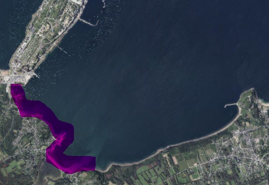 sur l'Anse du Fret depuis Run ar C’hranck jusqu’à l’entrée de la base opérationnelle de l’Île Longue, incluant donc le sillon du Fret, la grève du Fret et la grève du Zorn.