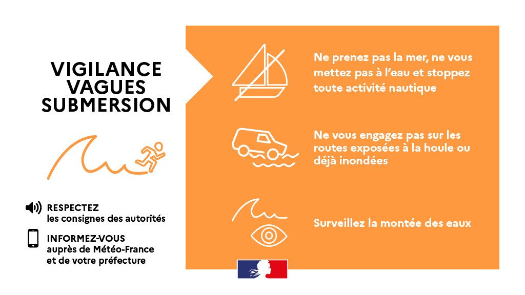 - Vagues/submersion : vigilance orange de 6 h à 23 h, jaune ensuite. Le coefficient de marée sera de 82 à 7 h 36 et de 80 à 19 h 55. Ces coefficients de marée, assurés d’une surcote liée à la dépression, pourraient donc perturber l’évacuation des eaux des ruisseaux côtiers.