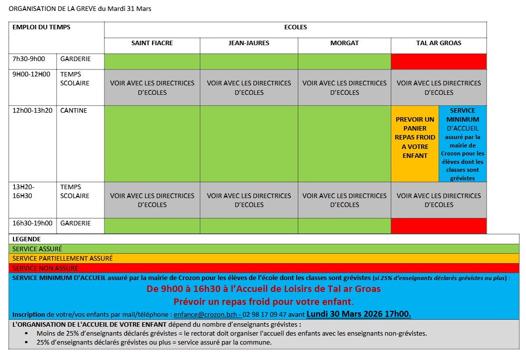 Suite au mouvement de grève annoncé, voici les dispositions prise par la Ville de Crozon pour assurer un service minimum d’accueil: