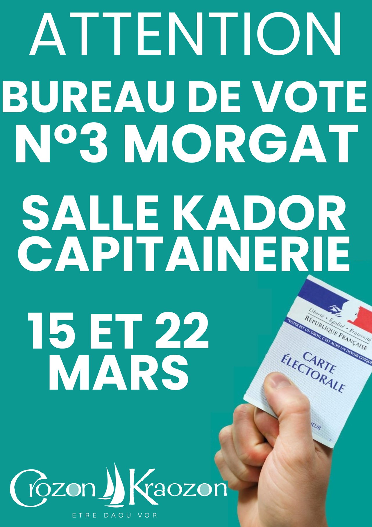 Les électeurs du quartier de Morgat sont informés que le bureau de vote n°3 est désormais situé à la salle Kador – capitainerie du port de Morgat.