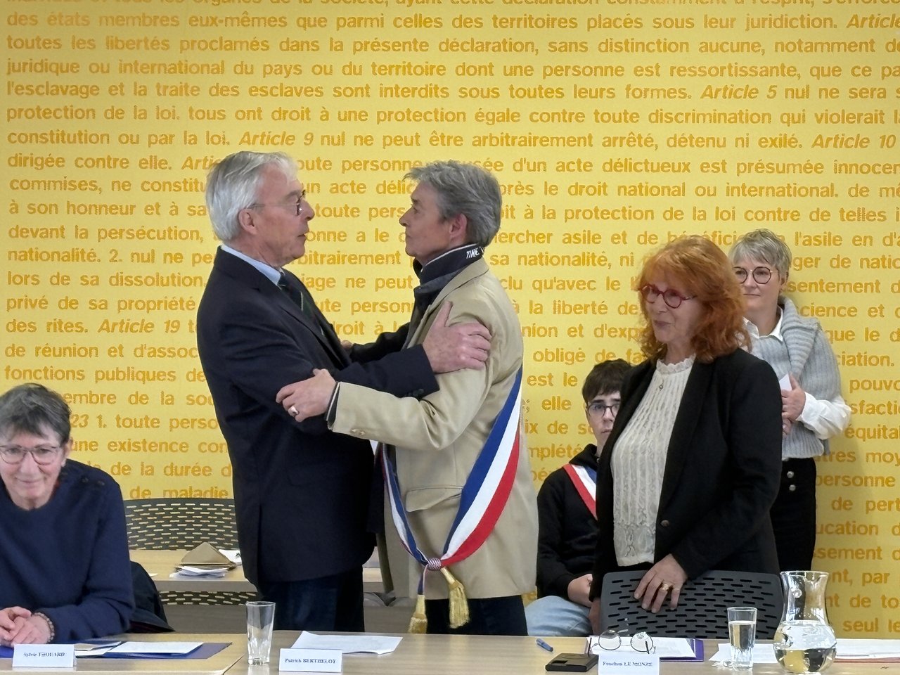 Moment symbolique de cette séance : le Maire sortant, Patrick Berthelot, a remis officiellement son écharpe de Maire à sa successeure, marquant ainsi la passation de fonction.