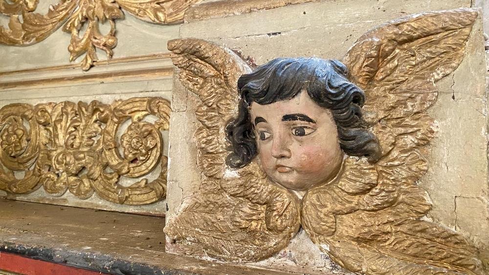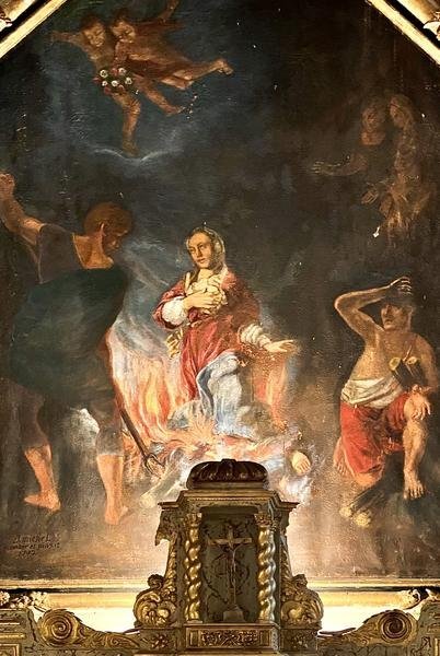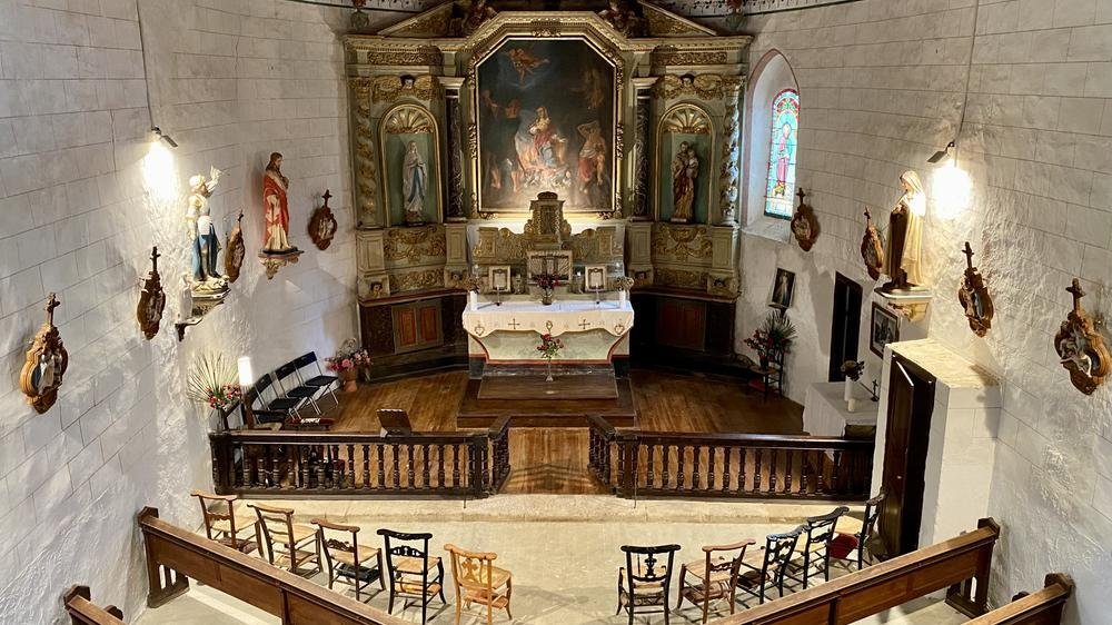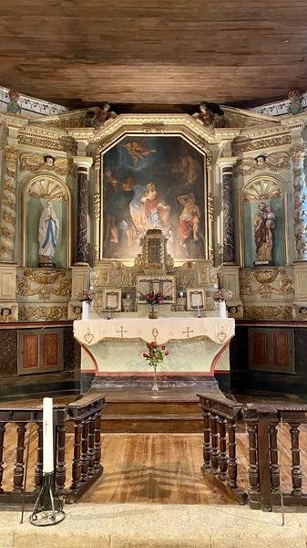 Parmi les trésors conservés, on distingue une cuve baptismale du XVIe siècle, symbole du rite initiatique chrétien, et un retable monumental du XVIIIe siècle représentant le martyre de Sainte Eulalie, inscrit à l’Inventaire Supplémentaire des Monuments Historiques. Derrière ce retable, un oculus circulaire rappelle la symbolique religieuse de l’infini et de la lumière divine.