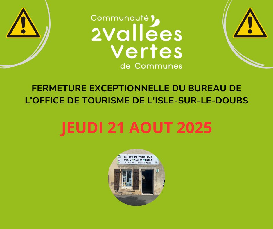 Le bureau de l’Office de Tourisme de L’Isle-sur-le-Doubs sera fermé exceptionnellement le jeudi 21 août 2025 toute la journée.
