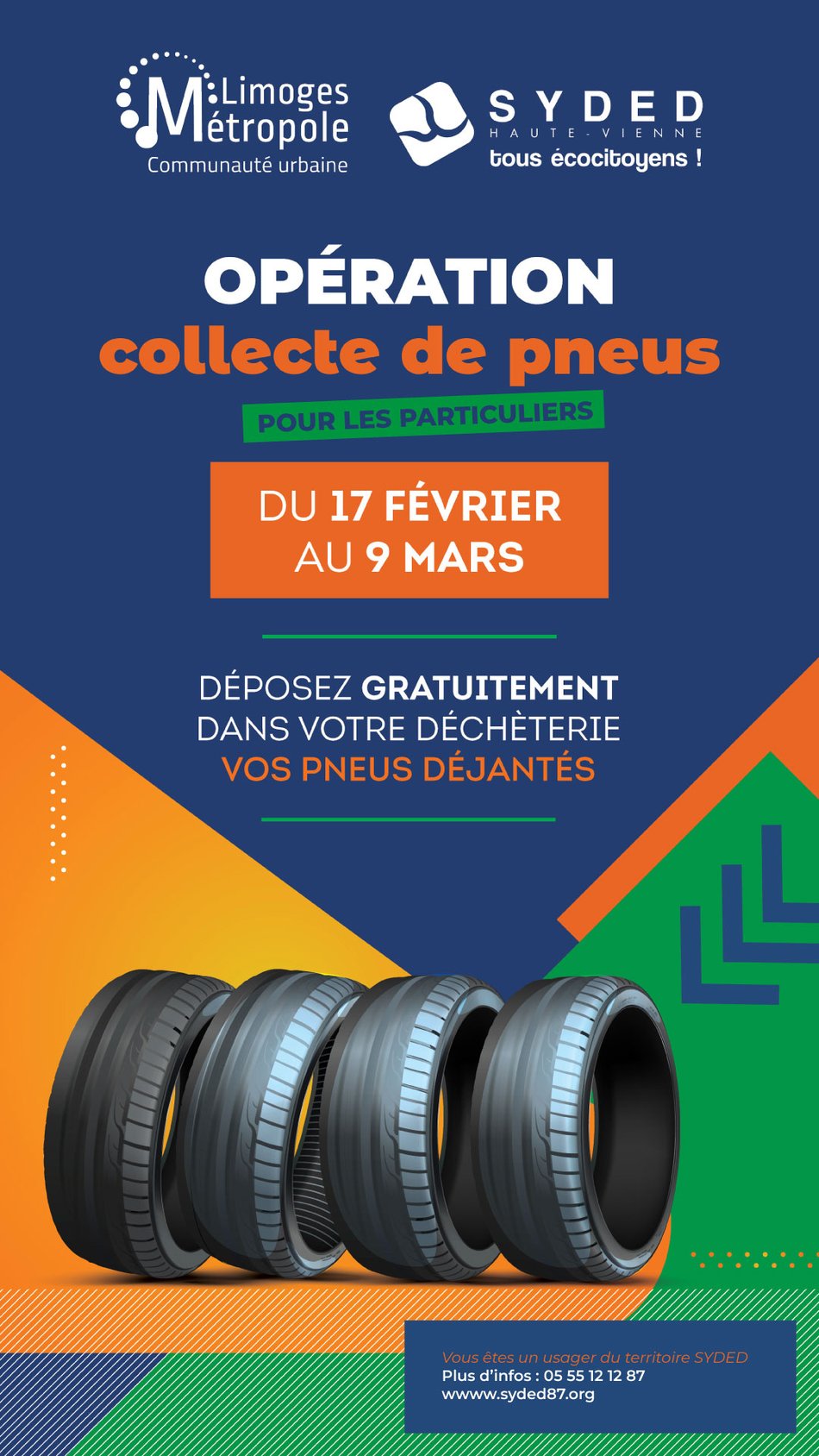 Pour la 8ème année consécutive, le SYDED organise une collecte exceptionnelle de pneus à destination des particuliers, du 17 février au 9 mars 2025 sur les déchèteries d’Ambazac, Bosmie-l’Aiguille, Châlus, Eymoutiers, Magnac Laval, Nexon, Saint-Bonnet-de-Bellac, Saint-Germain-les-Belles, Saint-Junien, Saint-Léonard-de-Noblat et Saint-Yrieix.